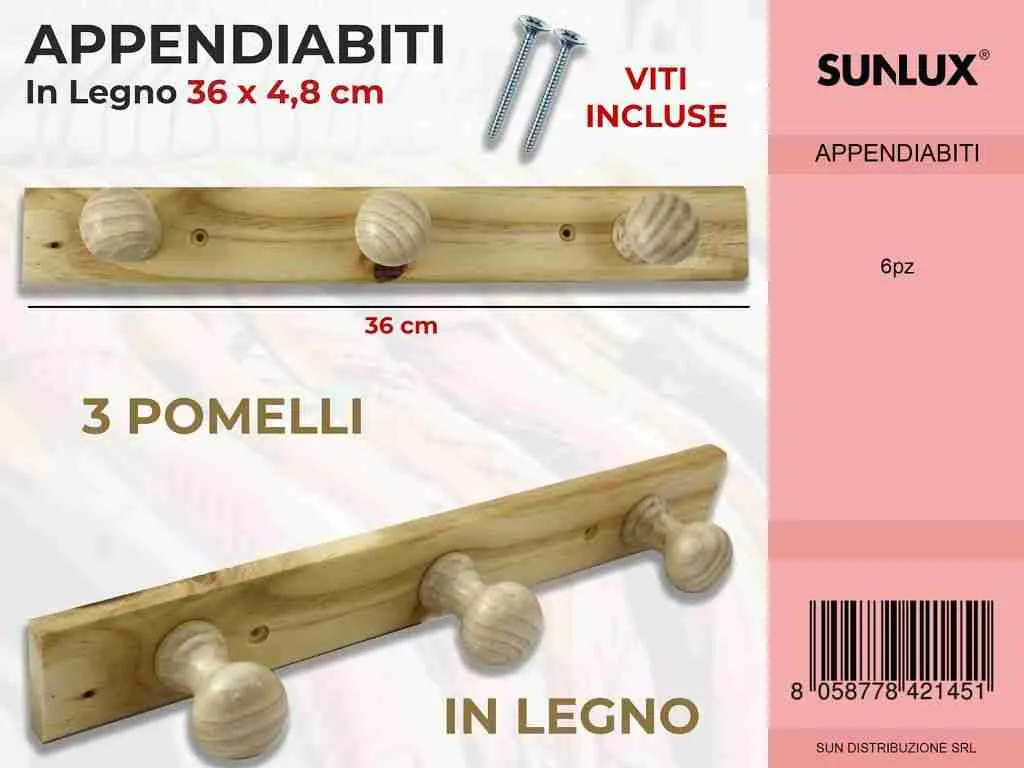 Appendiabiti In Legno 3 Pomelli 36*4.8cm