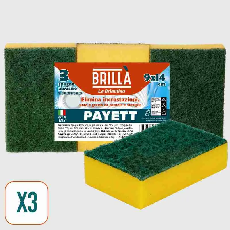 Spugne Payett con lato abrasivo verde. Formato maxi da 9×14 cm, confezione da 3 spugne. Alta densità, maggiore durata. Il lato superiore è rivestito da uno strato in fibra abrasiva per rimuovere lo sporco e le incrostazioni da pentole, bicchieri, posate e stoviglie.